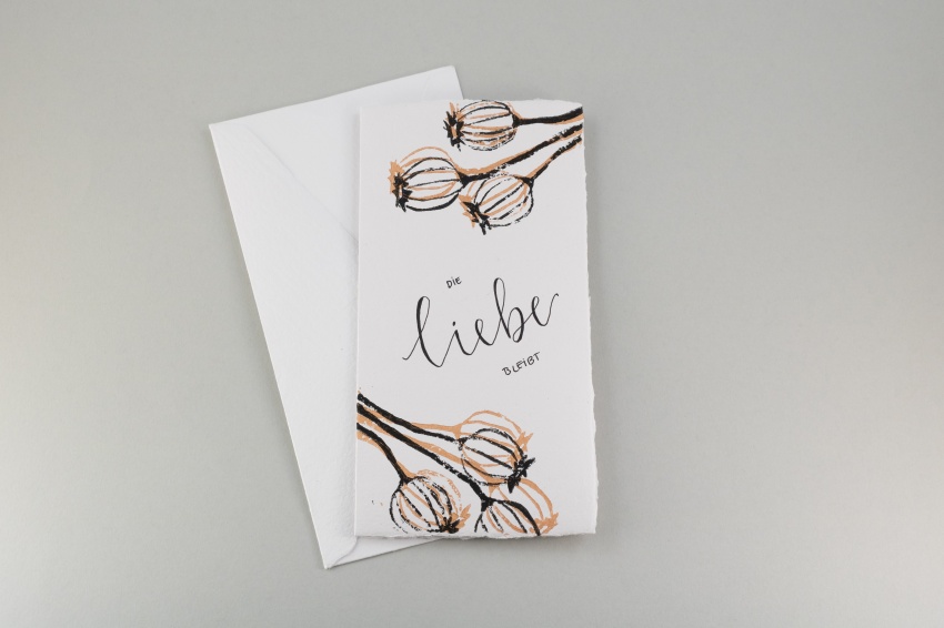 - Karte und Couvert aus handgeschöpftem Papier, in Handarbeit von unserer Papierwerkstatt hergestellt und dekoriert, inkl. weissem Einlegeblatt.